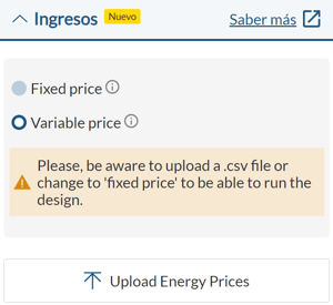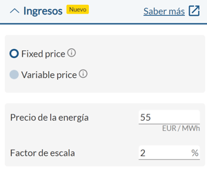 Por defecto, todas las simulaciones utilizarán un precio fijo para la venta de energía con un valor genérico, así como un factor genérico de incremento.