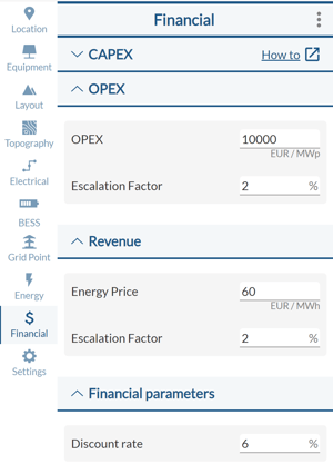 - Under the ‘OPEX’ section, user can define the annual operating costs of the PV plant [m.u/MWp] together with a year-on-year scaling factor to increase or decrease them.
