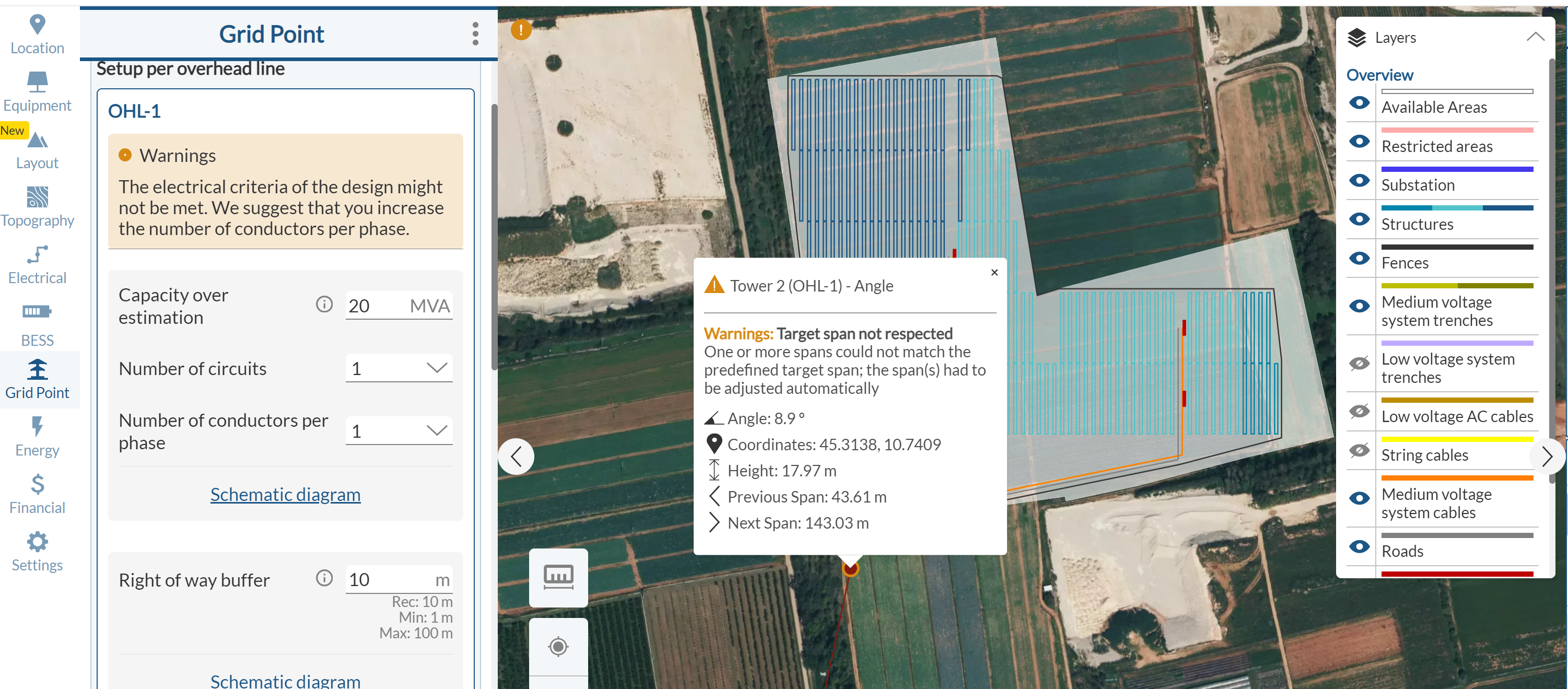 - Warnings might be displayed in the design process inside the grid point tab due to possible inconsistencies in the OHL characteristics. However, the documentation will still be generated, and these warnings will be included in the final report. This ensures that all relevant information is accounted for, and any potential issues identified are clearly flagged for further analysis.